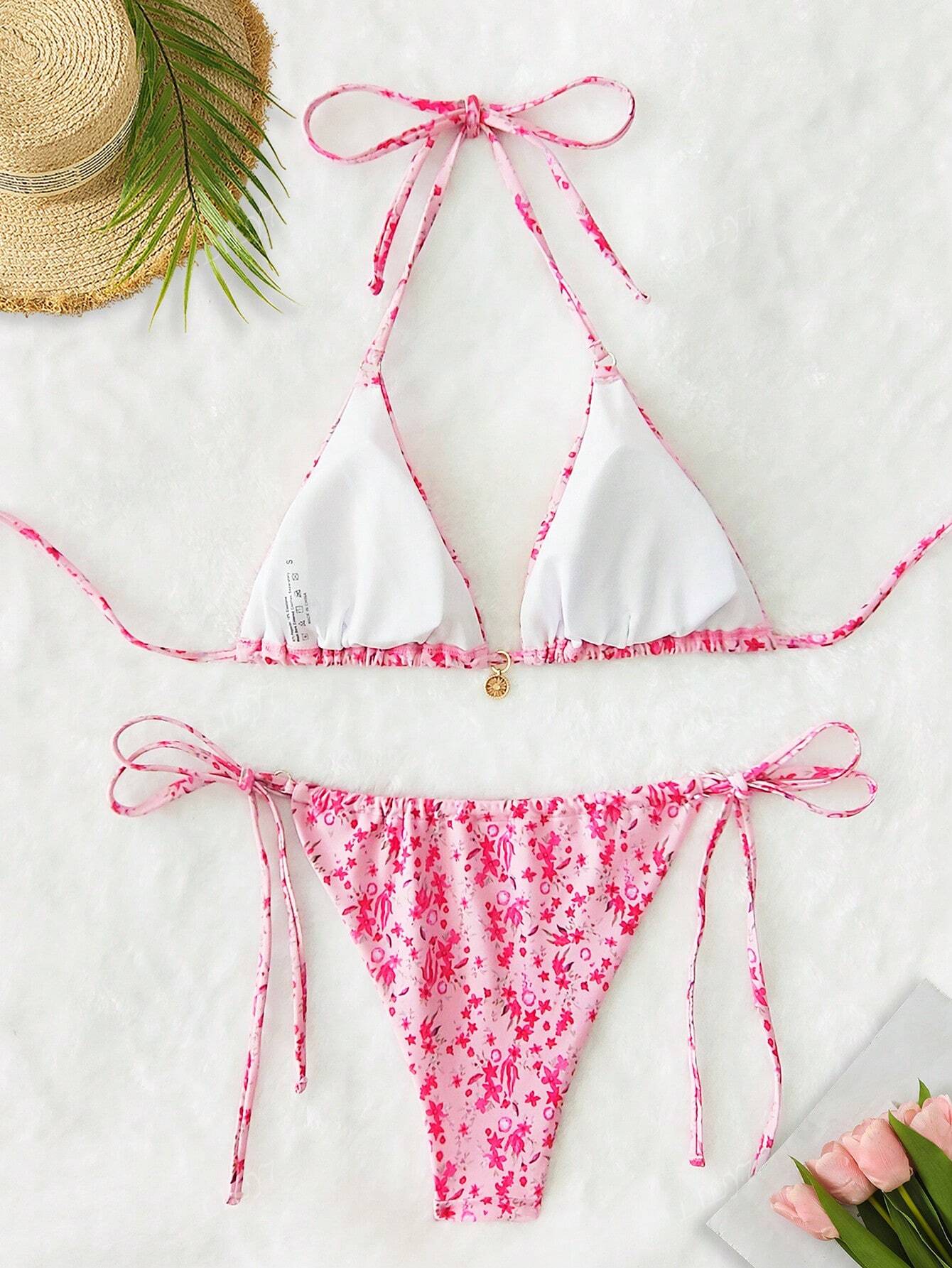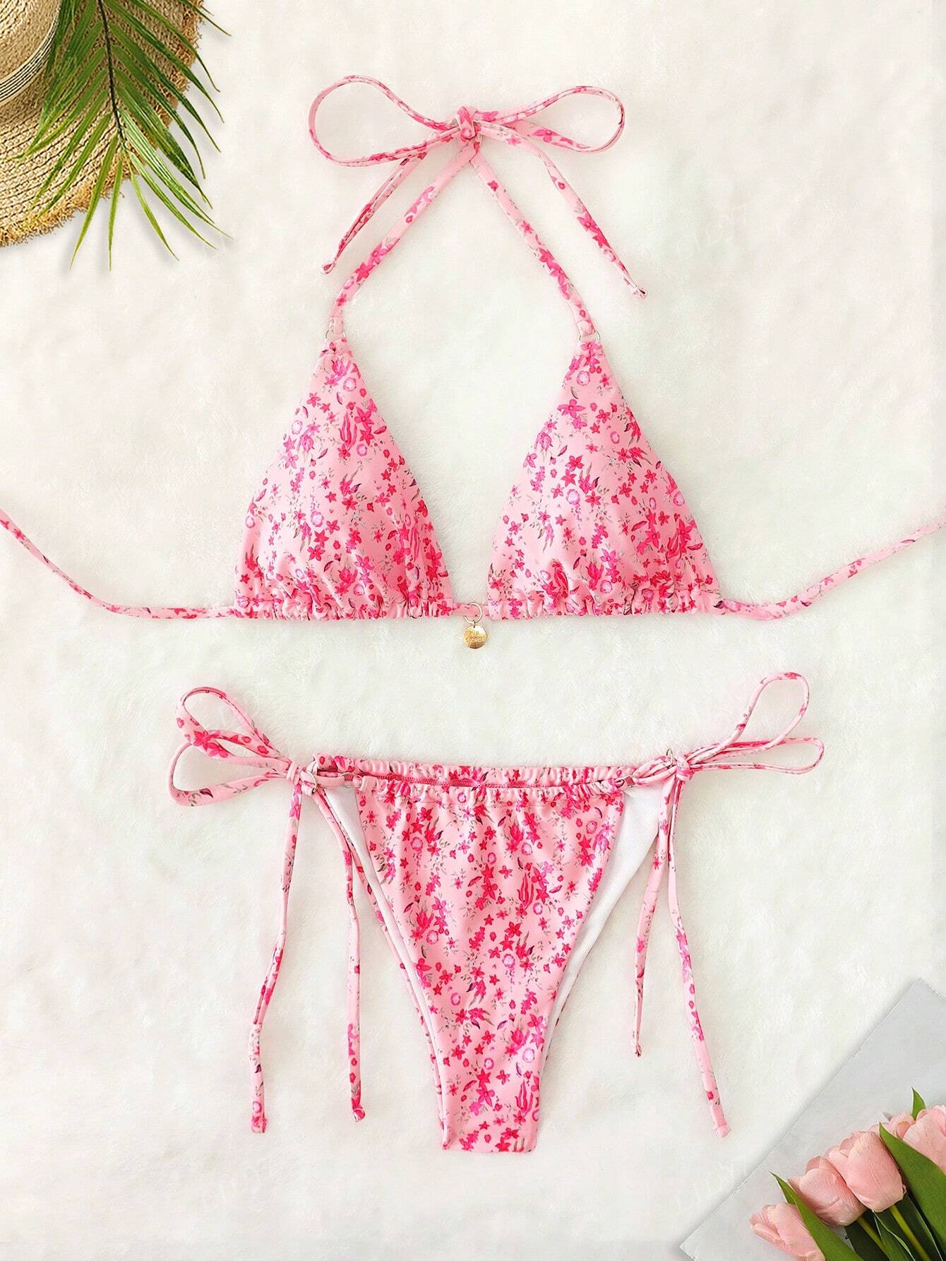 2pcs Pink Ditsy Floral Halter Bikini Set, For Summer Beach Vacation